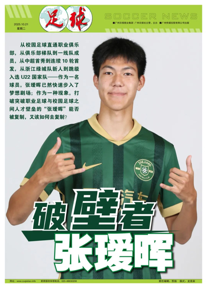 撰稿/左瑞 从校园足球直通职业俱乐部,从俱乐部梯队到一线队成员,从中超首秀到连续10轮首发,从浙江绿城队新人到跳级入选U22国家队——作为一名球员,张瑷晖已然快速步入了梦想剧场;作为一种现象,打破突破职业足球与校园足球之间人才壁垒的“张瑷晖”能否被复制,又该如何去复制?这比他本身更值得置身于体教融合浪潮中的每个中国足球人深思。